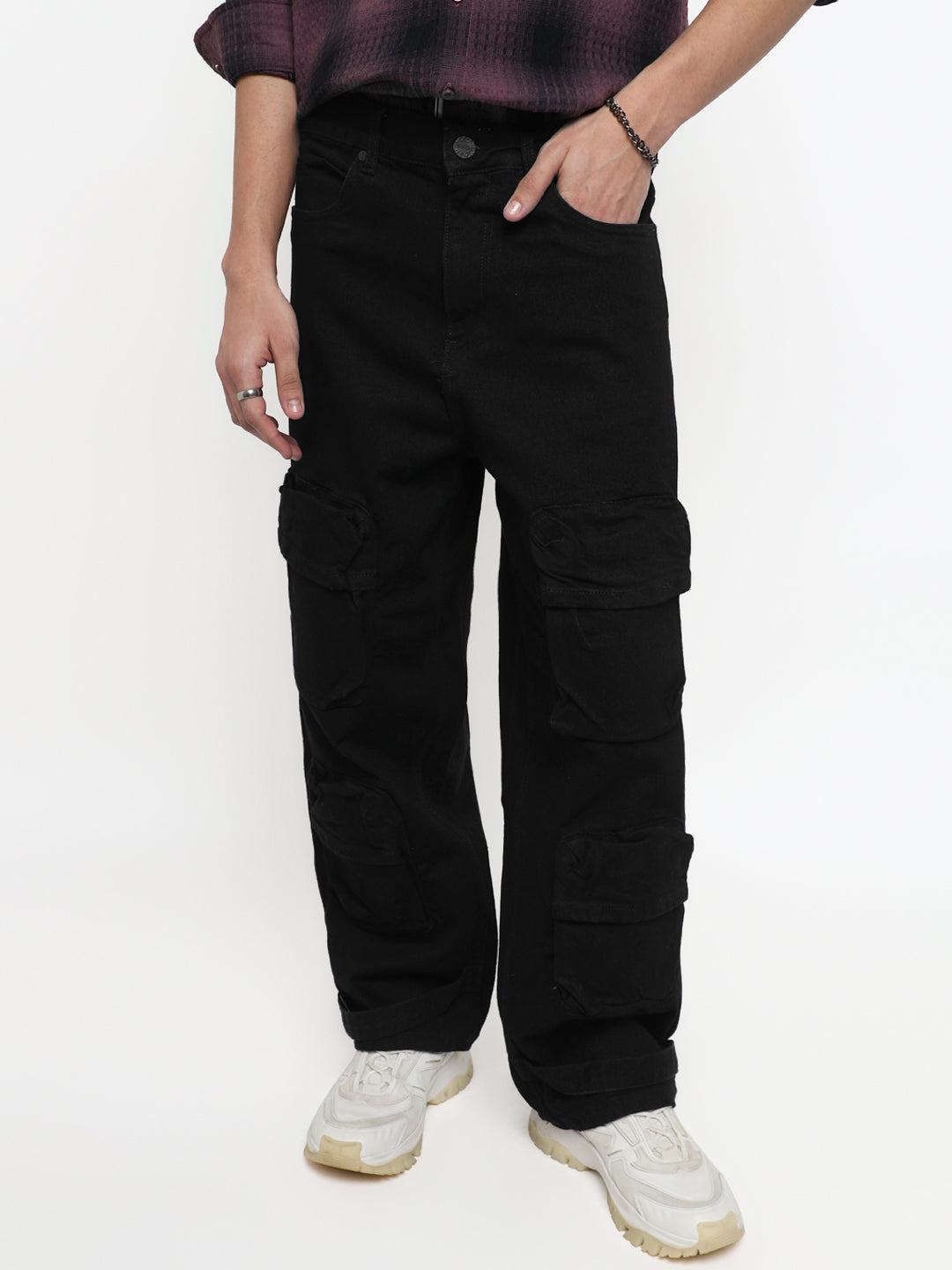Men Baggy Fit Stretch 8 Pocket Utlity Black Denim Cargo