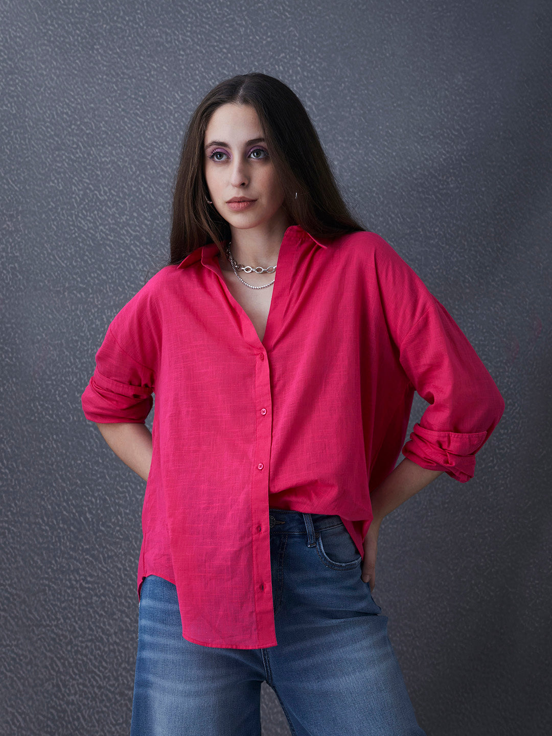 Thrust Relax Fit Street Vibe Cotton Pink Long Sleeve Women Casual Shirt