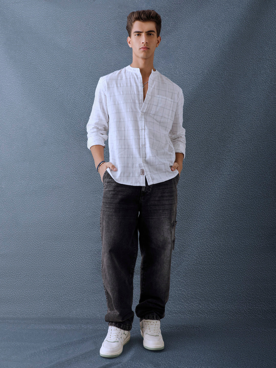 Men Relax fit White Checked Structured Mandarin Collar Casual Shirt