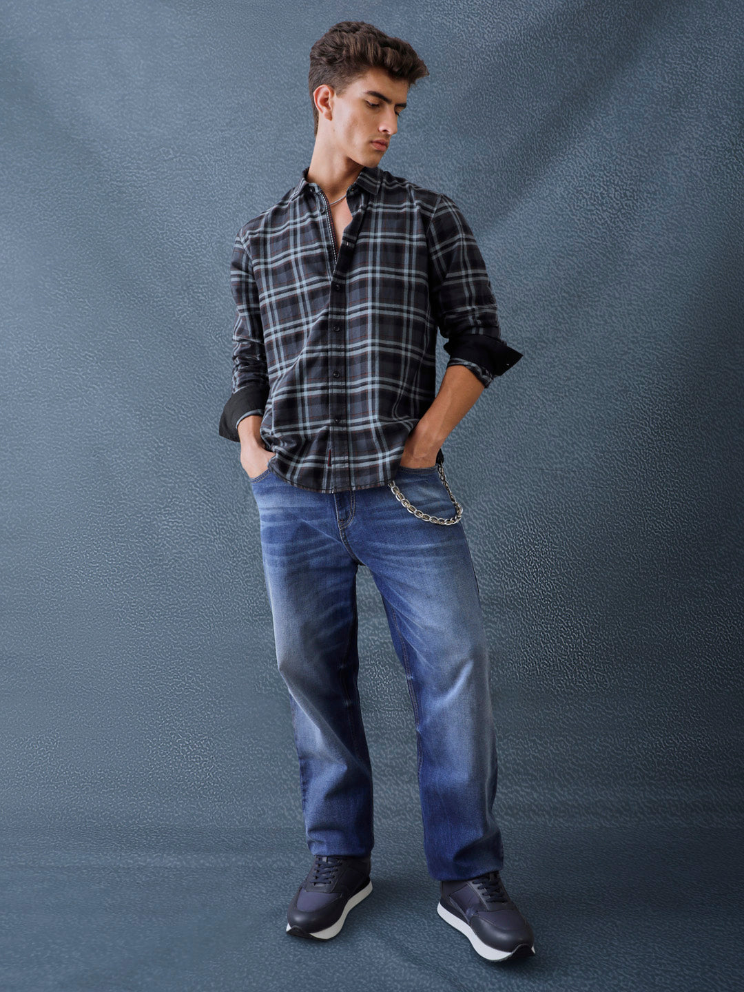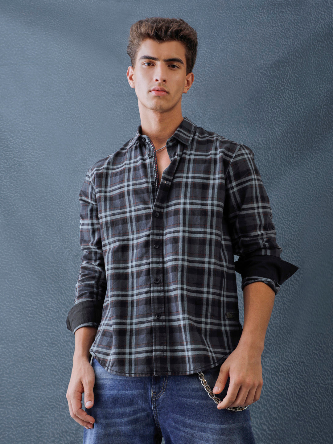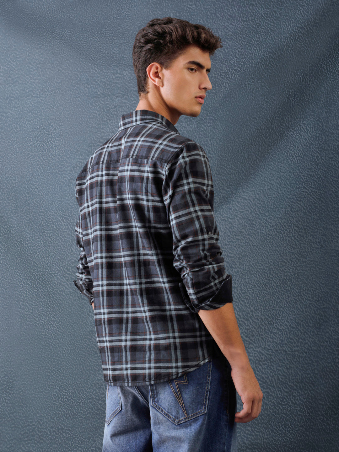 Men Relaxed Fit Charcoal Light grey Structured Checked Cotton Casual Shirt