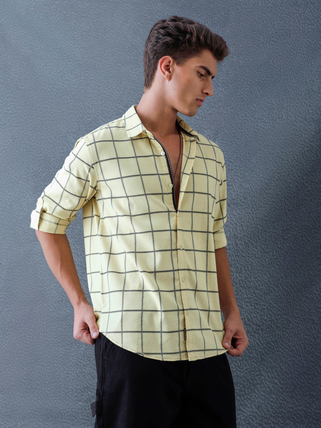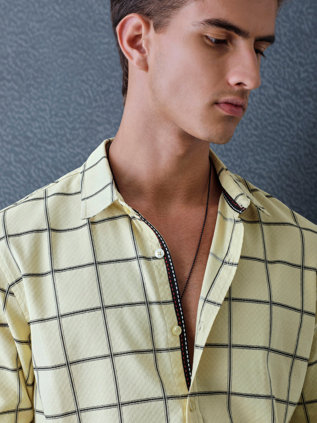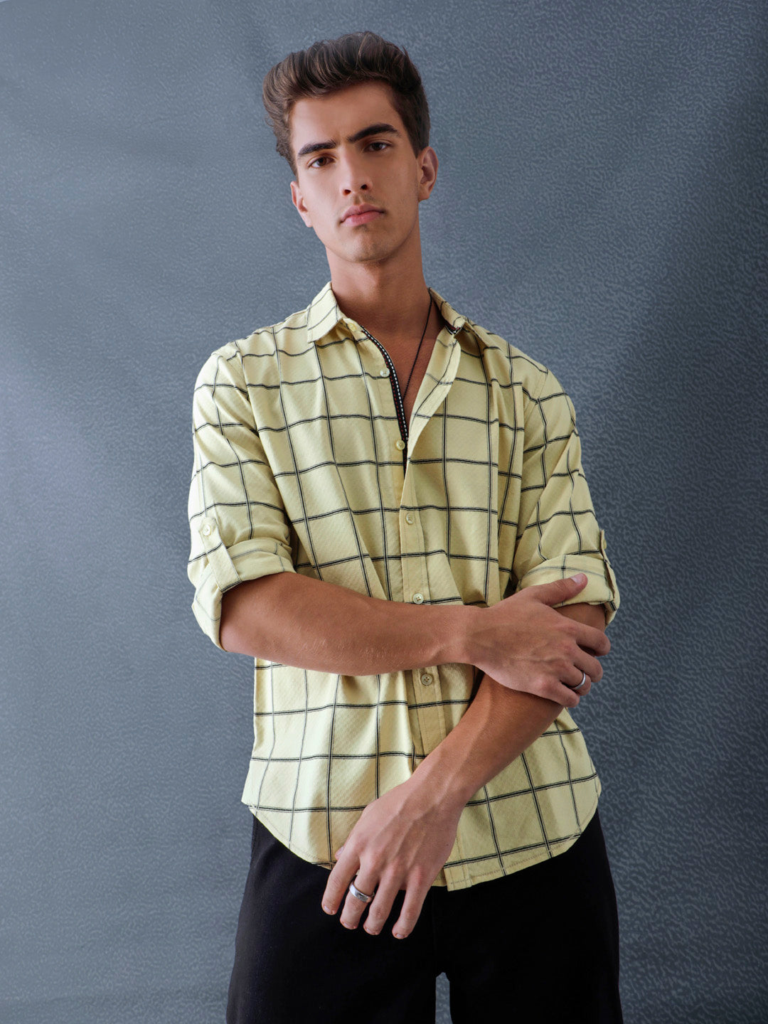 Men Relaxed Fit Light Beige Large Checked Premium Cotton Casual Shirt