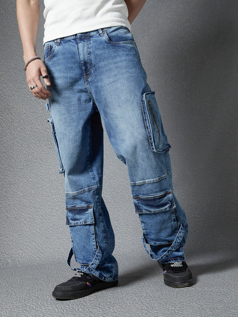 Men Premium Baggy Fit 8 Pocket Cotton Stretch Street Look Indigo Denim Cargo