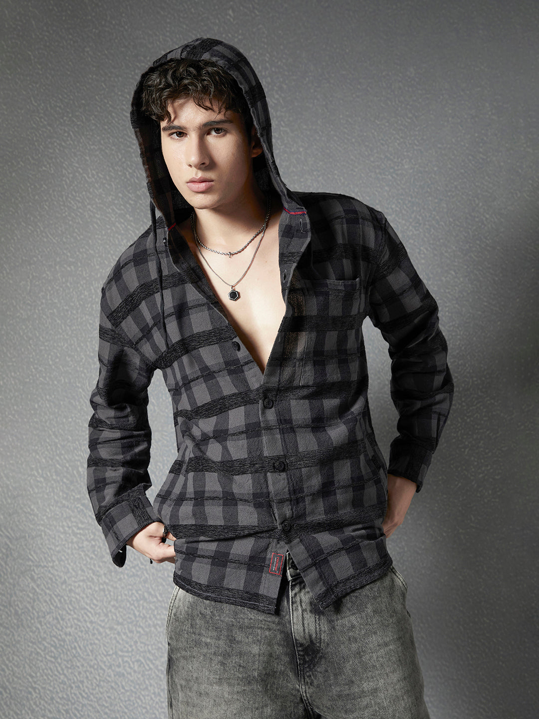 Voltedge Men Relax Fit Textured Grey Black Hoodie Shacket