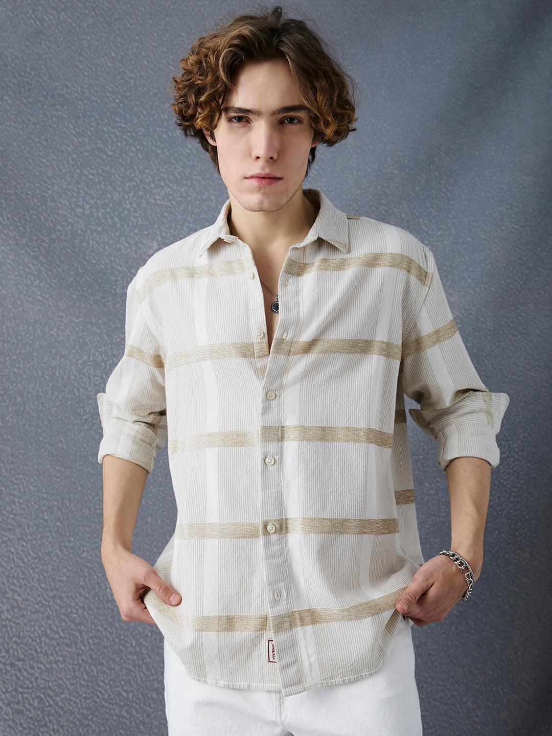 Men Premium Realxed Fit Textured Street Look Off White Cotton Casual Shirt