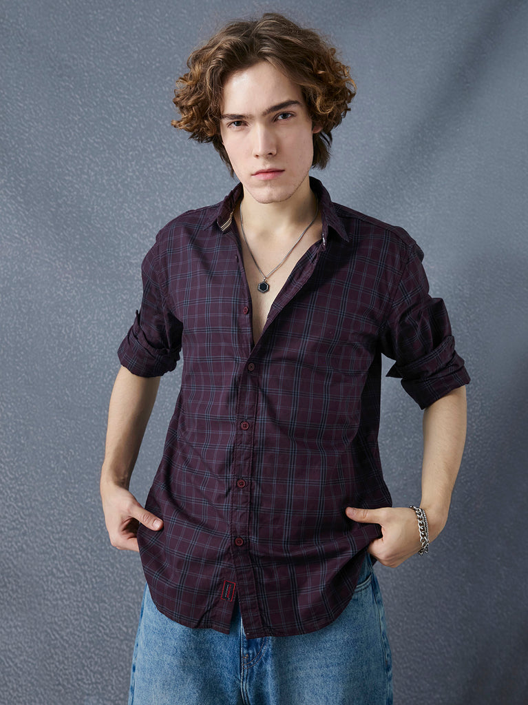 Men Regular Fit Premium Cotton Classic Wine Grey Checked Casul Shirt