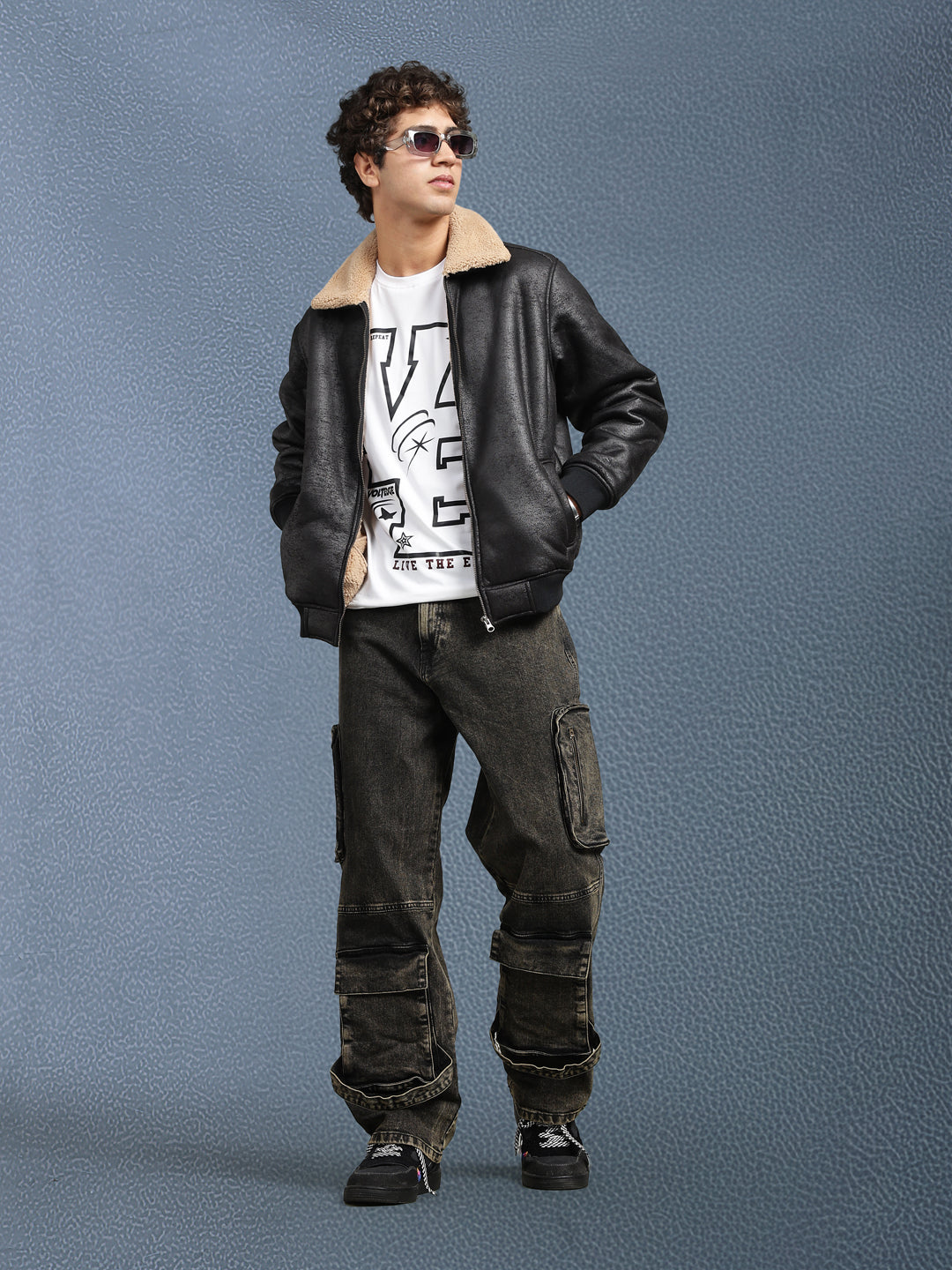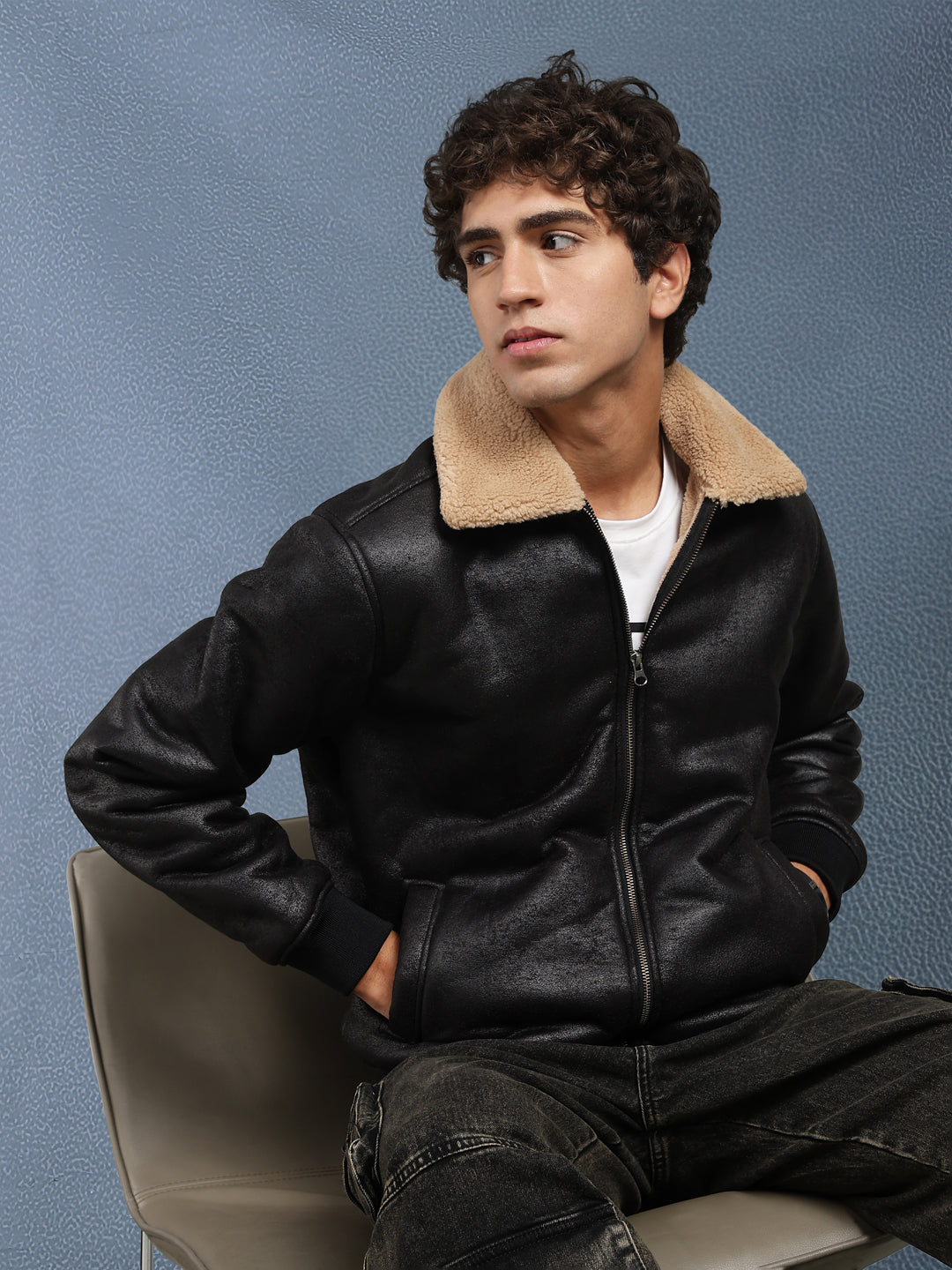 Men Regular Fit Black Crack Leather look Full Sleeve Jacket