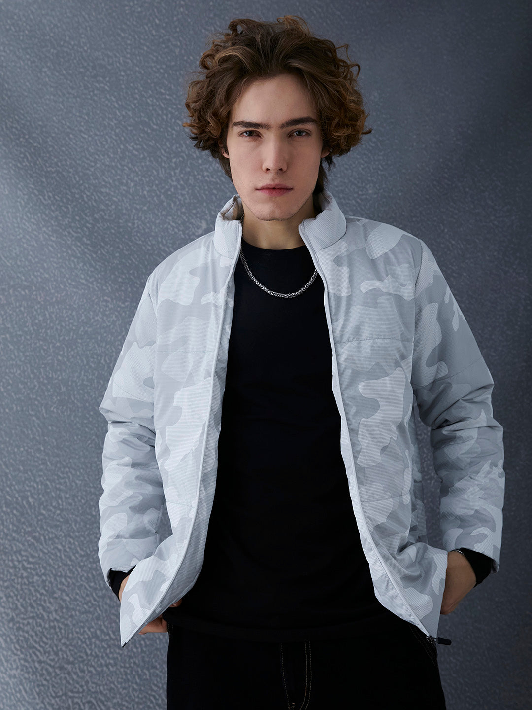 Dominate the streets with this high-neck printed jacket. Featuring a sleek industrial camo-style pattern and structured full-sleeve design, it merges technical performance with a bold, contemporary streetwear aesthetic for an elite edge.