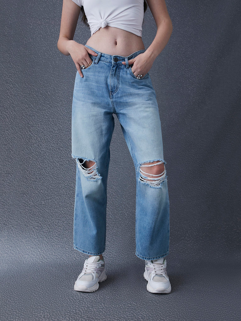 Women Premium baggy fit high waist distress washed street look Indigo Jeans