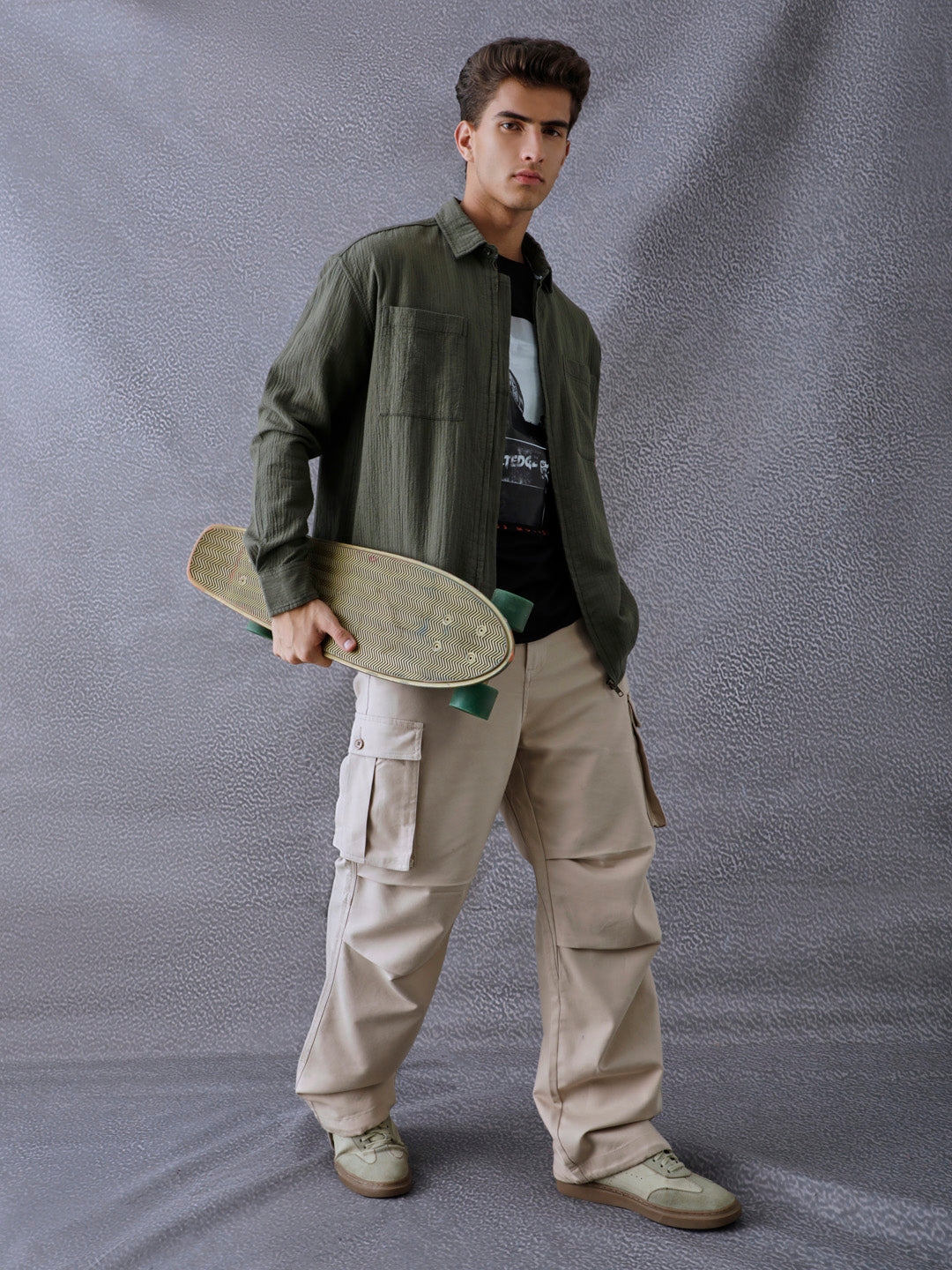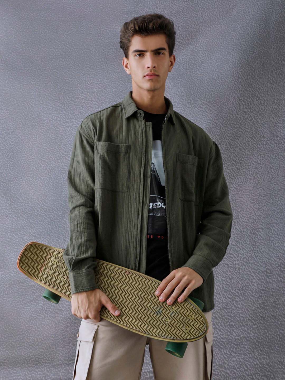 Voltedge Men Relaxed Fit Full Zip Street Look Olive Textured Fabric Shacket